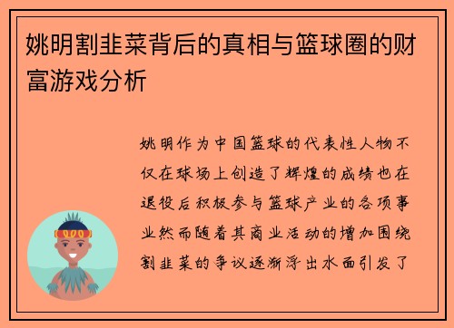 姚明割韭菜背后的真相与篮球圈的财富游戏分析
