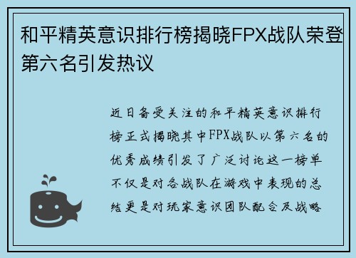 近日,备受关注的《和平精英》意识排行榜正式揭晓,其中FPX战队以第六名的优秀成绩引发了广泛讨论。这一榜单不仅是对各战队在游戏中表现的总结,更是对玩家意识、团队配合及战略思考等多方面能力的全面评估。FPX战队作为国内顶尖战队之一,此次排名的公布,无疑让他们获得了更多的关注与期待,也引发了电竞圈和玩家们对于其未来表现的热议。本文将从四个方面详细分析FPX战队在意识排行榜上的表现及其背后的意义,探讨这一排名对战队本身及整个电竞行业可能带来的影响与启示。