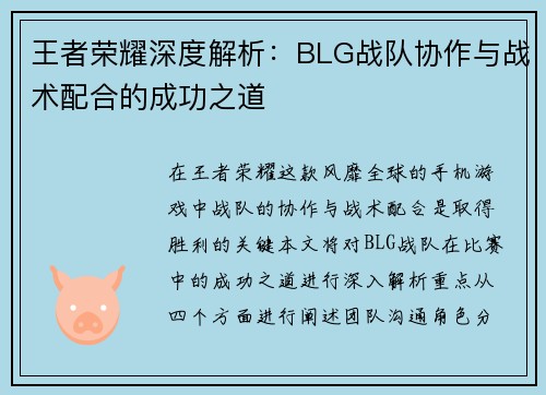 在《王者荣耀》这款风靡全球的手机游戏中,战队的协作与战术配合是取得胜利的关键。本文将对BLG战队在比赛中的成功之道进行深入解析,重点从四个方面进行阐述:团队沟通、角色分工、战术执行以及心理素质。通过对这些方面的详细探讨,我们将看到BLG战队如何在激烈的竞争中脱颖而出,形成独特的战斗风格,并最终赢得比赛。在分析过程中,我们不仅会揭示其背后的战略思考,还会结合实际比赛案例,让读者更直观地理解成功的秘诀。