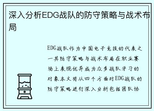 EDG战队作为中国电子竞技的代表之一,其防守策略与战术布局在职业赛场上表现优异,成为众多战队学习的对象。本文将从四个方面对EDG战队的防守策略进行深入分析,包括团队协作、视野控制、资源管理和应变能力。首先,EDG战队在团队协作上展现出极高的默契,通过精准配合来提升整体防守能力;其次,视野控制是其成功的重要因素,良好的视野布置能有效预判敌方动向;第三,资源管理则是确保防守持续性的关键,通过合理分配资源使得每位成员都能发挥最大效能;最后,应变能力让EDG能够快速调整策略以应对变化多端的比赛情况。通过对这四个方面的详细阐述,希望能够为读者提供一个全面而深入的理解。